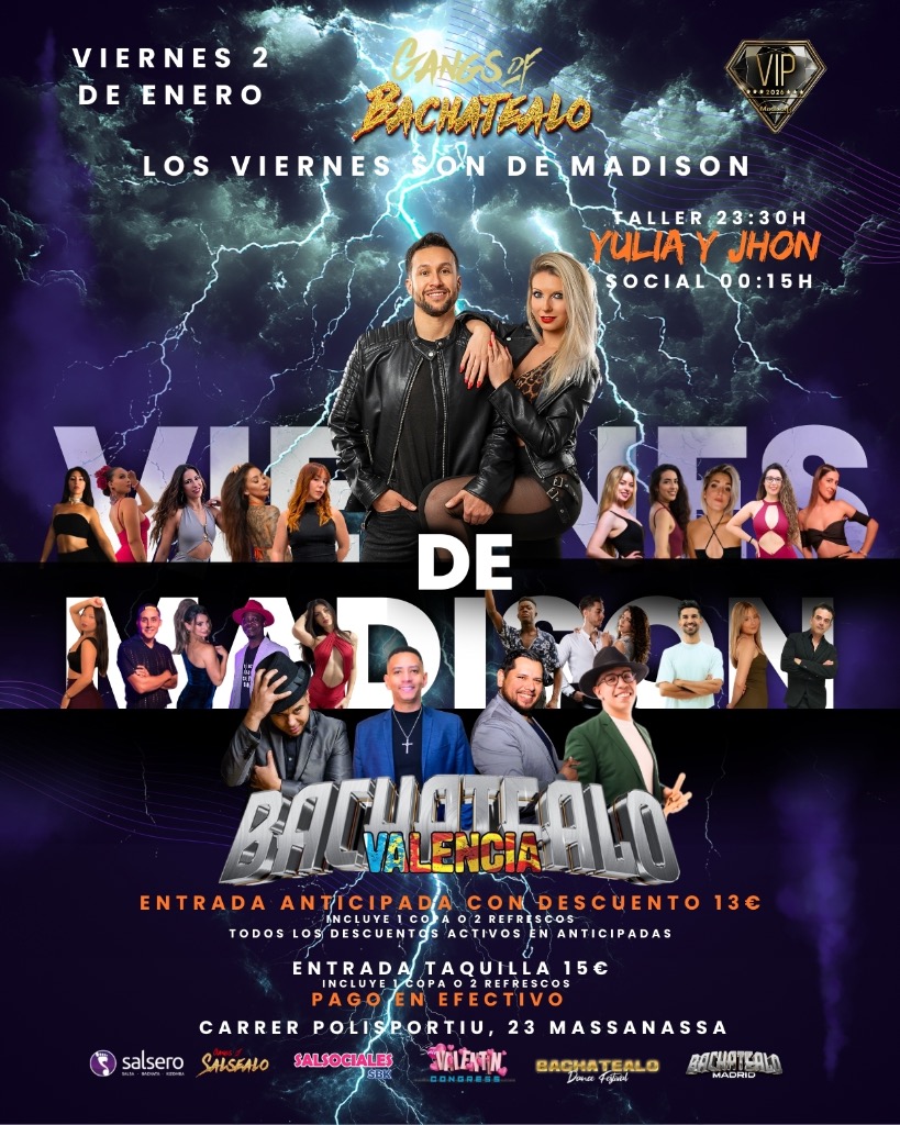 Queremos arrancar el nuevo año contigo, después de un 2025 tremendo de fiestas, energía y baile… ✨recuperando el lugar que una sala como Madison merece. Porque los viernes son de Madison, de Bachatealo y de Gangs! 😎🤵‍♂️
