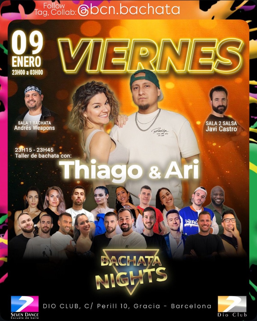 On this special night, you'll have the presence of amazing artists like Thiago, Ari, Andrés Weapons, and Javi Castro, who will guide you on a sound journey you won't want to miss. 🎶 No matter if you are a beginner or an expert! Everyone is welcome to join the fun and learn the best bachata moves in our workshops. 🌟
