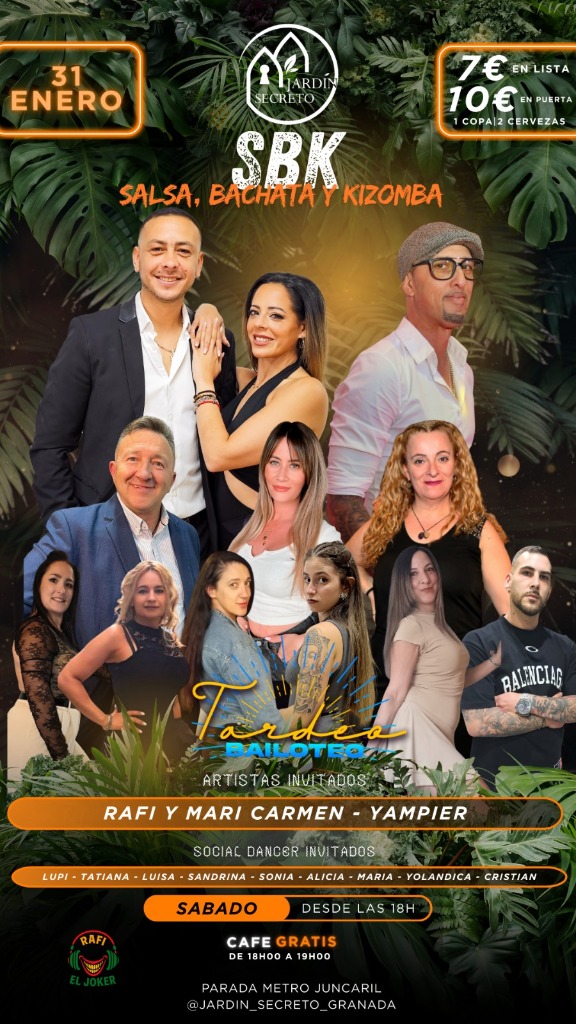 🎉 Welcome to the Tardeo Bailoteo en Jardín Secreto! 🌿 An event where energy and passion for dance merge in a magical atmosphere. This is the perfect place to disconnect and let yourself be carried away by the contagious rhythms of salsa, bachata, and kizomba. Come enjoy an afternoon full of movement, laughter, and great company. 💃