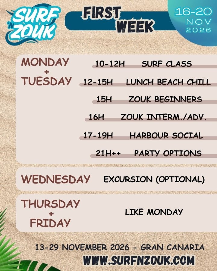 No hace falta tener experiencia en surf; los principiantes absolutos son bienvenidos. ¡Aprende a disfrutar de las olas junto con otros zoukeros! Si lo prefieres, puedes reservar tu DANCE PASS por separado, sin surf, y tener más tiempo para relajarte en la playa.
