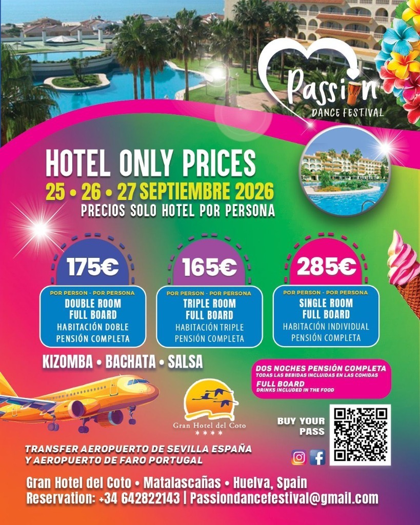 Del 25 al 27 de septiembre de 2026, el increíble Passion Dance Festival llega al Gran Hotel del Coto en Matalascañas (Huelva, España) para reunir a bailarines de todo el mundo en un evento lleno de energía, aprendizaje y momentos mágicos.
