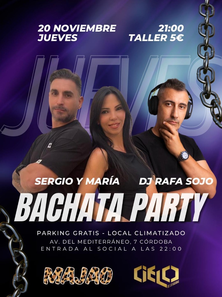 At this party, you will enjoy a bachata workshop led by the talented Sergio and María, who will teach you the most sensual and fun steps. 🎶 Plus, the incredible DJ Rafa Sojo will keep you dancing all night with the best bachata hits. You can't miss it! 🎵