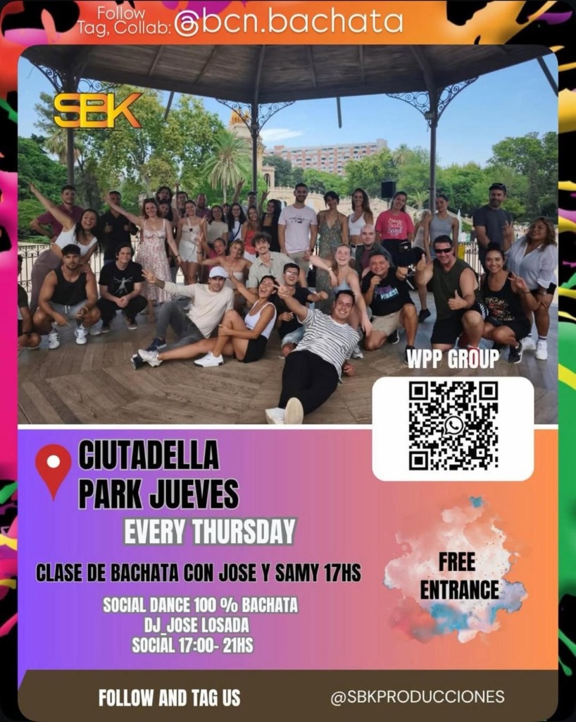 🎉 Get ready for a vibrant experience in the heart of the city! 🌟 The BACHATA CLASS WITH JOSE AND SAMY invites you to dive into the passionate rhythm of bachata in the beautiful Ciutadella Park. This event is the perfect opportunity to connect with friends and enjoy an afternoon full of energy and joy. 💃